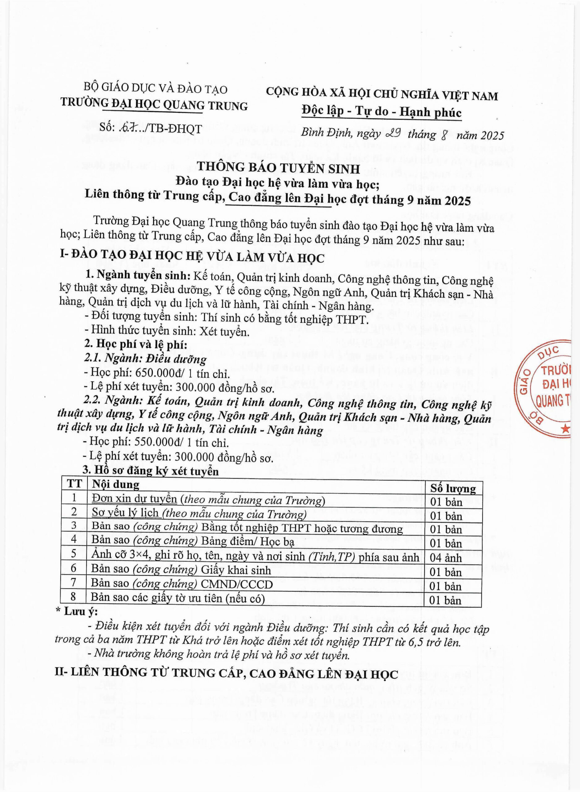 Announcement of enrollment for part-time university training, transfer from intermediate and college to university, September 2025